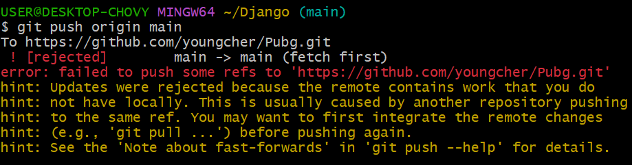 해당 에러는 Git에서 로컬 브랜치와 리모트 브랜치가 서로 다른 경우 발생하는 충돌로 인한 문제라고 한다.