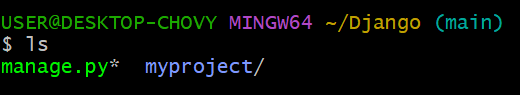 manage.py, myproject 폴더가 잘 들어온 것을 확인 할 수 있다.
