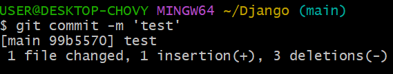 1개의 파일이 수정상태이고 'test'라는 이름으로 커밋이 되었다.