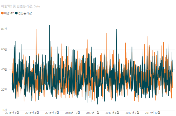 이번에 알아볼 DAX함수는 SAMEPERIODLASTYEAR과 DATEADD함수다 두가지 모두 날짜 함수로, 데이터를 연도별로 비교하는데 사용이 된다. 먼저 SAMEPERIODLASTYEAR를 살펴보자 뭐니뭐니해도 예시로 확인하는게 짱이다. 전년동기값2 = CALCULATE([매출액2],SAMEPERIODLASTYEAR('Calendar'[Date])) SAMEPERIODLASTYEAR안에 날짜 열이 들어가고 '전년동기값'이라는 측정값을 시각적개체로 보게되면 음... 그림이 지저분하니 표로 확인해보면 잘 계산이 됨을 확인할 수 있다. 그리고 마찬가지로 DATEADD를 보게되면 이 함수는 좀 다르게 날짜를 어떤 단위로 얼만큼 이동할건지 사용자가 설정 할 수있다. 전년동기값2 = CALCULATE([매출액2..